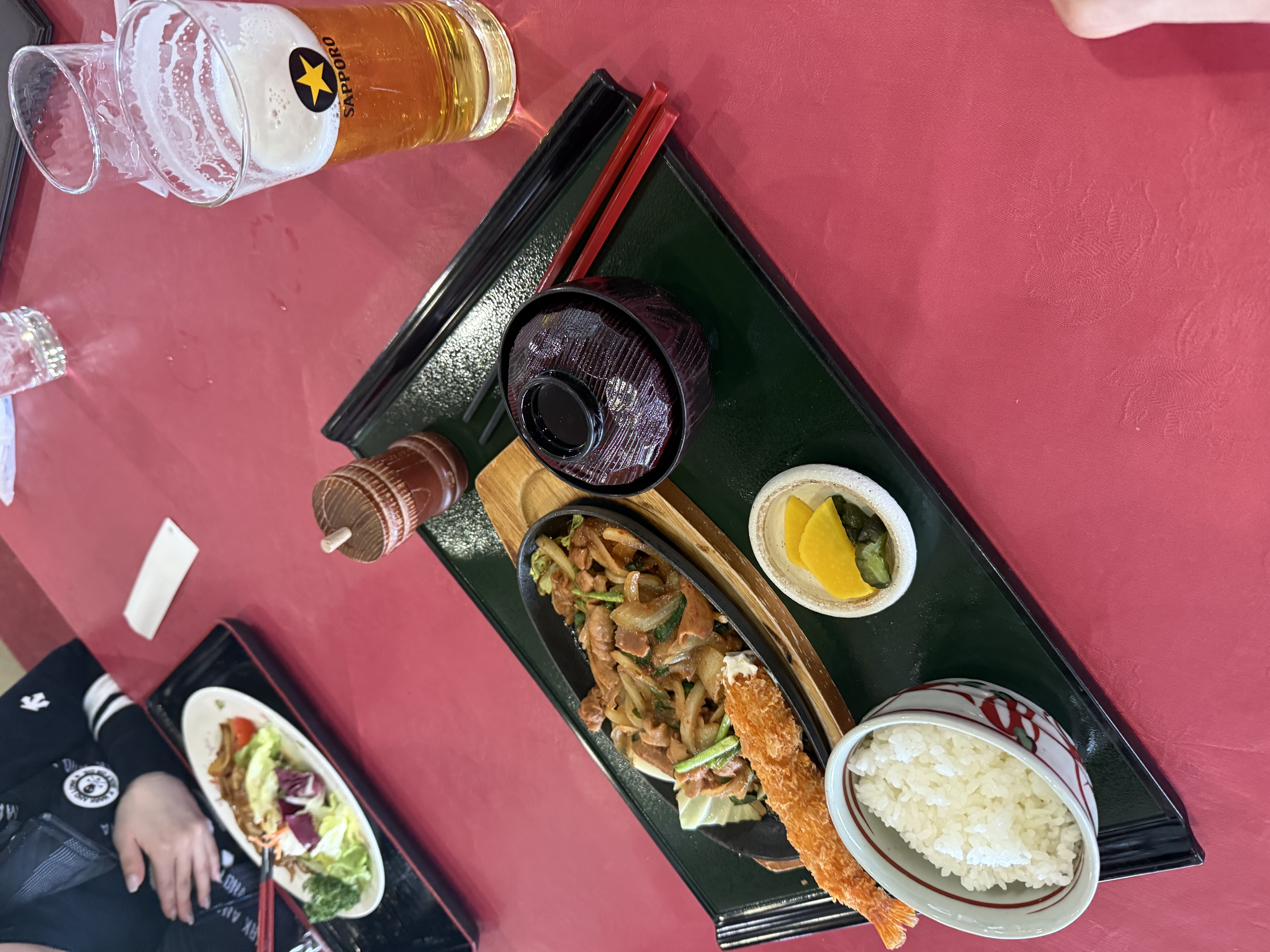 이 날 점심은 "정식"으로 갔습니다. 철판 볶음(고기+양파 베이스)에 새우튀김, 밥, 국, 피클까지 기본 구성이 단단한 타입이라 라운딩 중간에 에너지를 채우기에 좋았습니다.